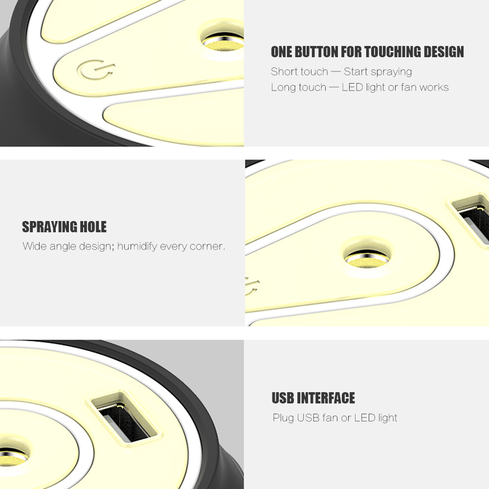 – Dilengkapi Lampu Dan Kipas USB Selain berfungsi sebagai humidifier, alat ini juga menyediakan port USB yang dapat Anda hubungkan dengan kipas ataupun lampu USB yang tersedia. Anda hanya perlu menancapkan kipas/lampu pada port USB yang ada pada bagian atas alat, dan tekan tombol on/off lebih lama untuk menyalakannya.